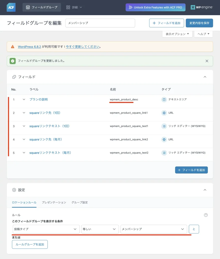メンバーシップの編集ページで追加したカスタムフィールドにリンク決済でコピーした「リンク」とそのリンク名を入力する