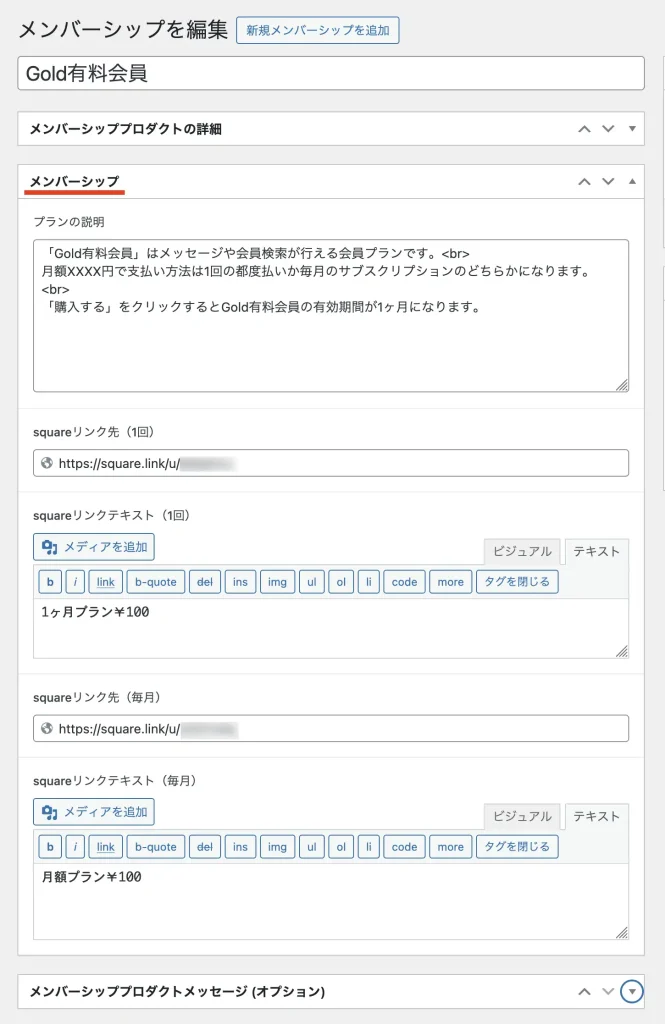 Squareリンク決済「リンク」が作成出来たら次に「リンク」で実際に決済出来るようにメンバーシップを拡張する。