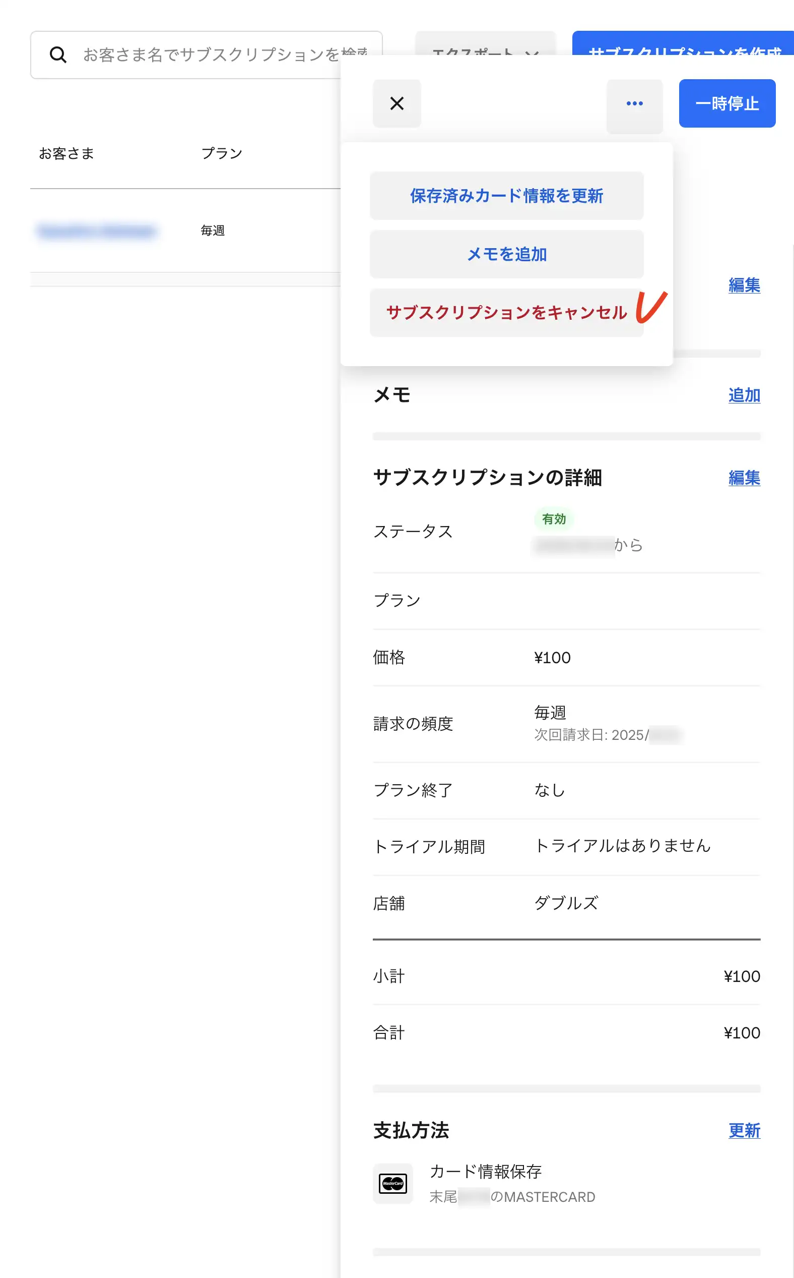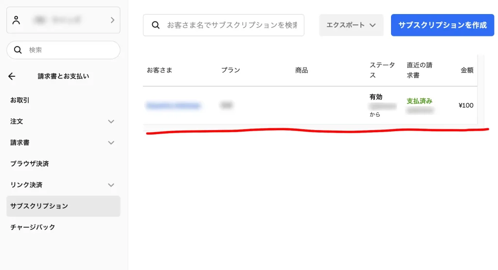 Squareの管理ページではサブスクリプション一覧にサブスクで決済されたリストが表示される。